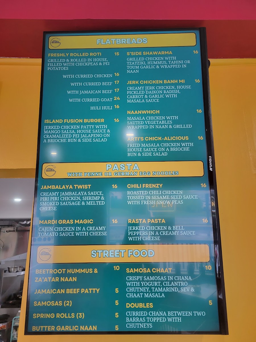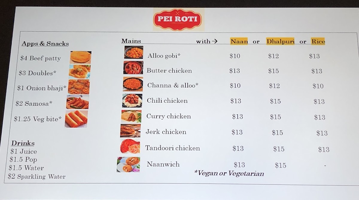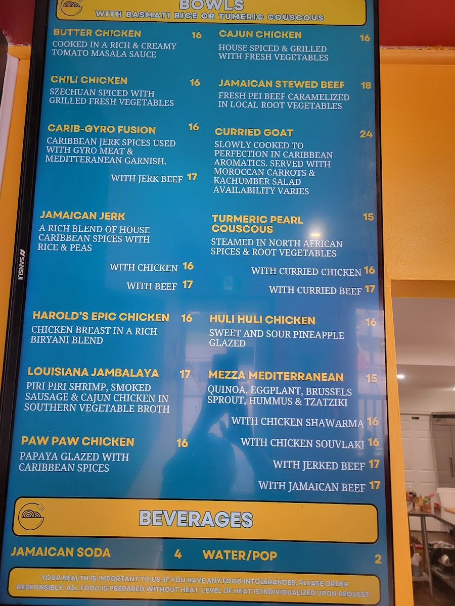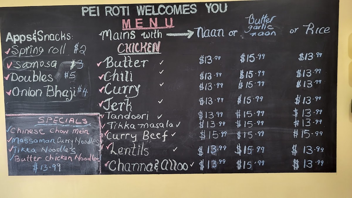 From a reviewer’s perspective, the menu at Pei Roti Food Fusion offers a compact yet flavorful selection that leans heavily into bold, globally inspired comfort food. The bowl options stand out, with hearty choices like BUTTER CHICKEN, CAJUN CHICKEN, CHILI CHICKEN, LOUISIANA JAMBALAYA, and HAROLD'S EPIC CHICKEN, each suggesting rich seasoning and satisfying portions. The flatbread section adds even more variety, featuring creative items such as S'SIDE SHAWARMA, ARTI'S CHICK-A-LICIOUS, NAANWICH, ISLAND FUSION BURGER, and FRESHLY ROLLED ROTI, all of which highlight the restaurant’s fusion concept. To round things out, the menu includes extras like FINGER FOODS, BOTTLED CHUTNEYS, and sides like Couscous, along with beverage options such as IMPORT JAMAICAN SODA and DOMESTIC POP & WATER. While pricing details aren’t listed, the diversity and creativity of the dishes make the menu feel both approachable and exciting, leaving a strong impression of a place that prioritizes bold flavors and cultural variety.