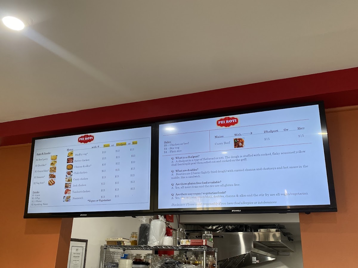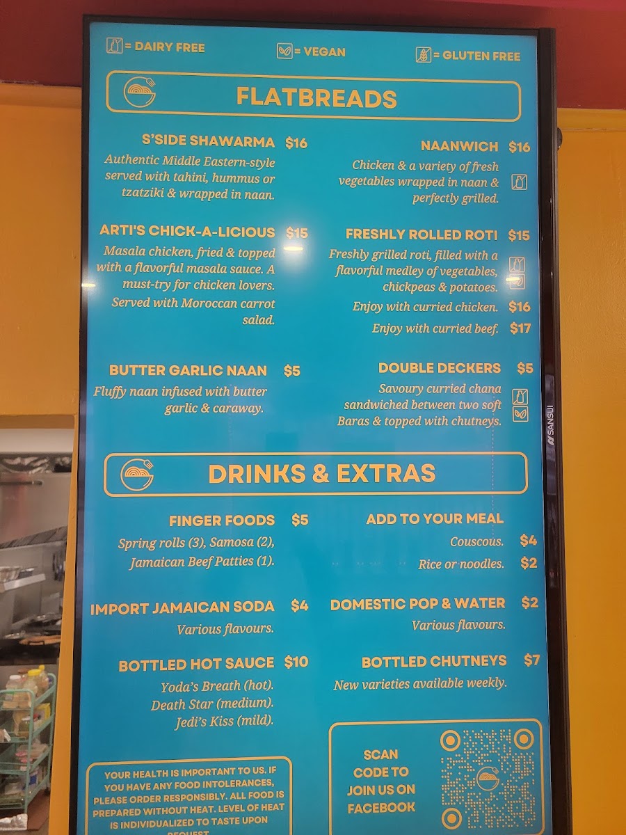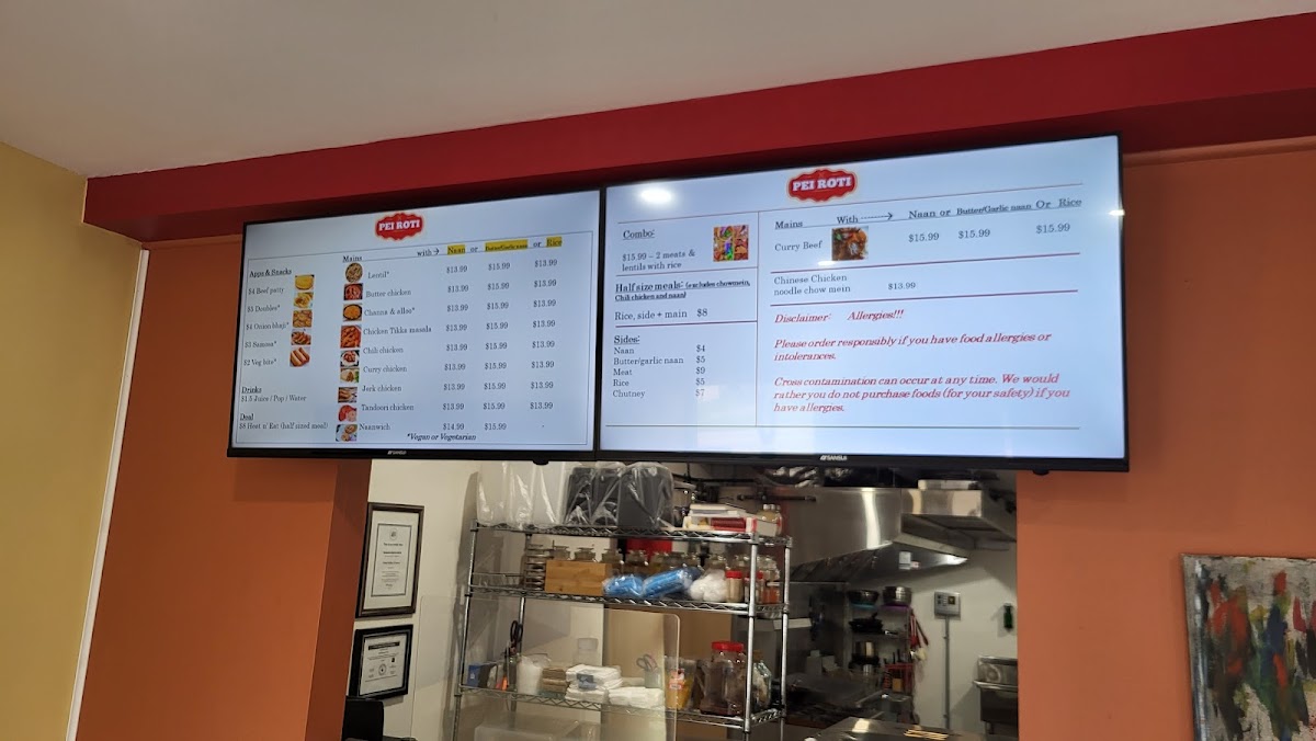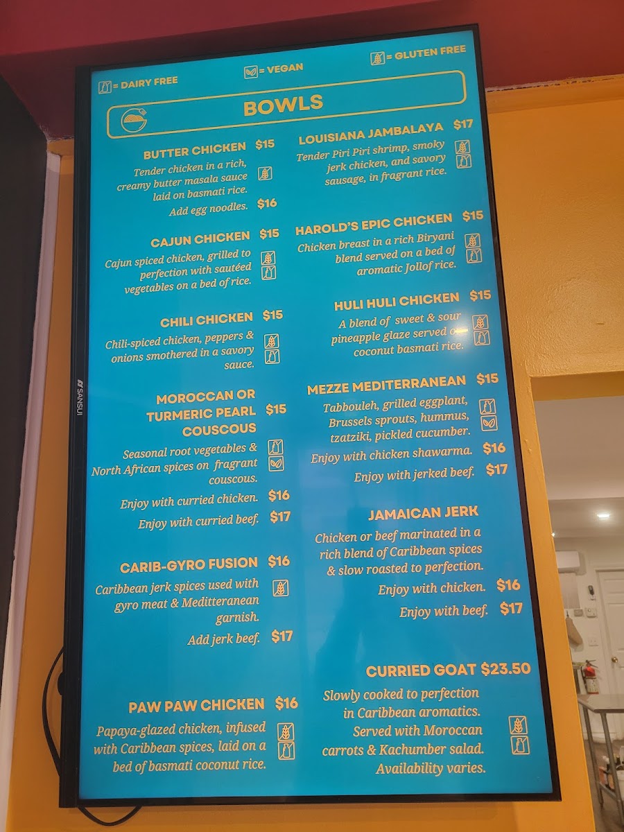 From a reviewer’s perspective, the menu at Pei Roti Food Fusion offers a compact yet flavorful selection that leans heavily into bold, globally inspired comfort food. The bowl options stand out, with hearty choices like BUTTER CHICKEN, CAJUN CHICKEN, CHILI CHICKEN, LOUISIANA JAMBALAYA, and HAROLD'S EPIC CHICKEN, each suggesting rich seasoning and satisfying portions. The flatbread section adds even more variety, featuring creative items such as S'SIDE SHAWARMA, ARTI'S CHICK-A-LICIOUS, NAANWICH, ISLAND FUSION BURGER, and FRESHLY ROLLED ROTI, all of which highlight the restaurant’s fusion concept. To round things out, the menu includes extras like FINGER FOODS, BOTTLED CHUTNEYS, and sides like Couscous, along with beverage options such as IMPORT JAMAICAN SODA and DOMESTIC POP & WATER. While pricing details aren’t listed, the diversity and creativity of the dishes make the menu feel both approachable and exciting, leaving a strong impression of a place that prioritizes bold flavors and cultural variety.